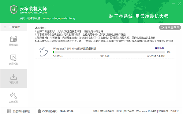1.系统检测,下载软件完软件后正常打开("云净装机大师"), 程序会默认检测当前系统环境,检测完成后,点击"下一步"。